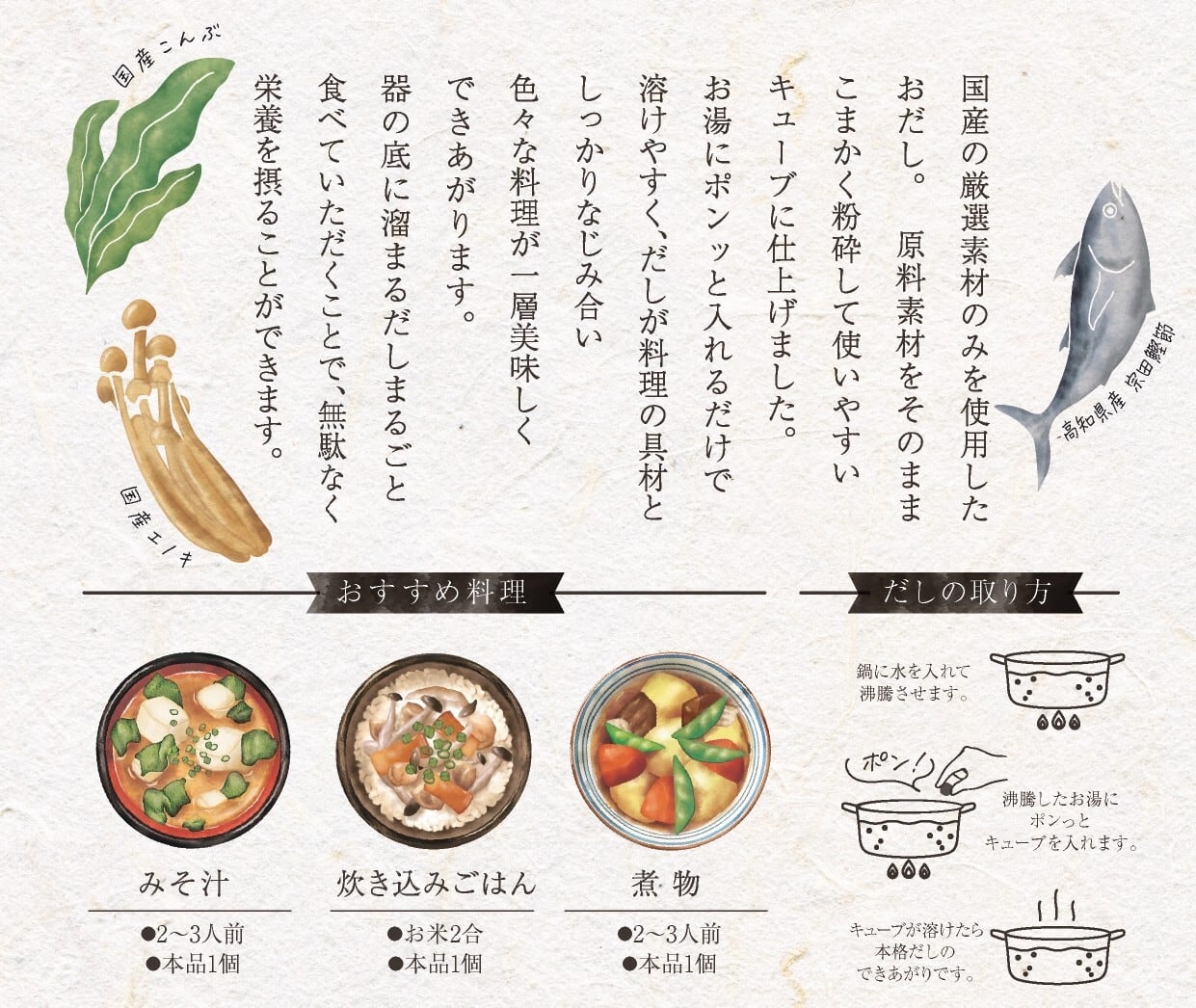 国産の厳選素材のみを使用したおだし。原料素材をそのままこまかく粉砕して使いやすいキューブに仕上げました。
